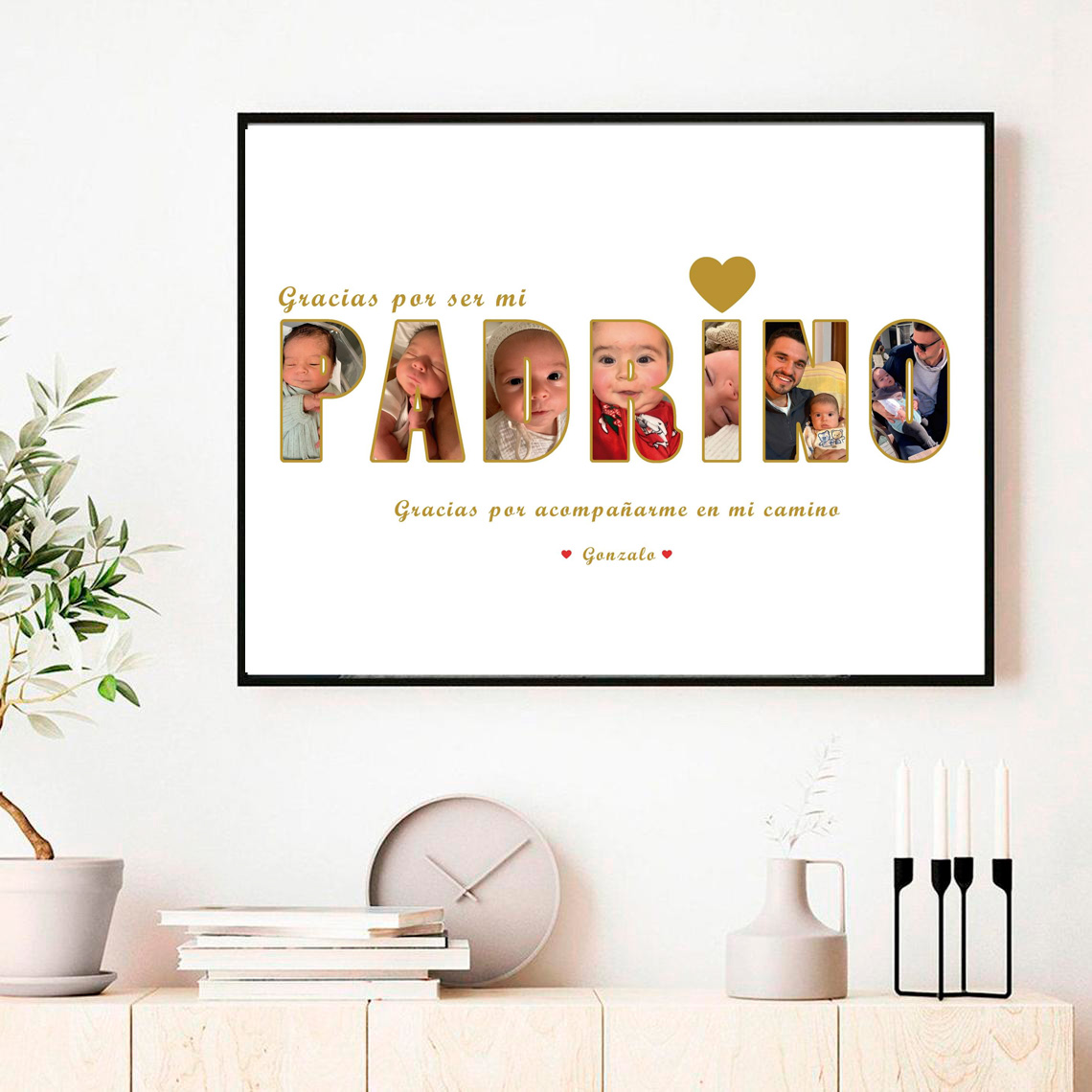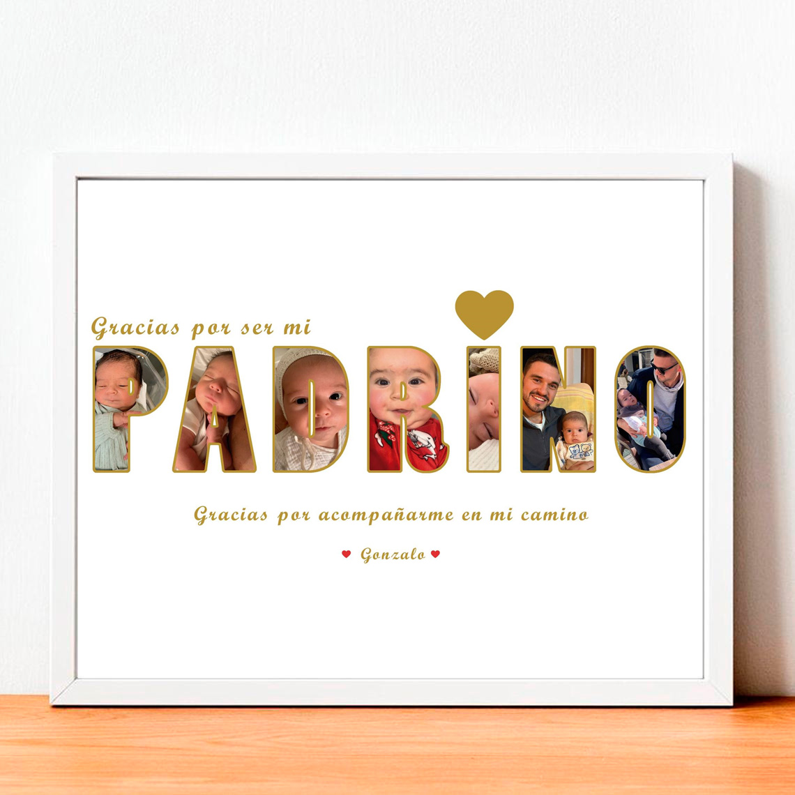 Encontrar el regalo perfecto para un padrino no siempre es fácil. Queremos algo especial, personal y que tenga un significado profundo. Por eso hemos creado este collage de fotos con la palabra PADRINO, una pieza única en la que cada letra se convierte en una fotografía llena de recuerdos, cariño e historia.